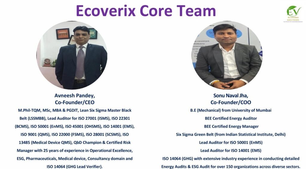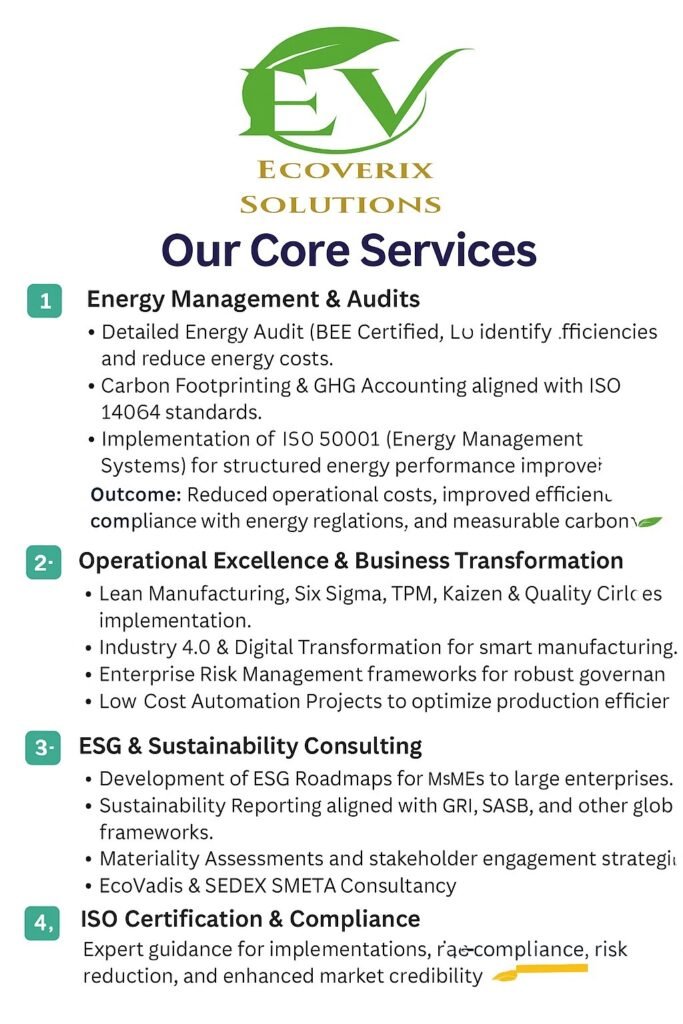 Welcome to Ecoverix Solutions Private Limited-Your Trusted Partner for Sustainable Business Success. At Ecoverix Solutions Private Limited, we are dedicated to empowering businesses to thrive in today's dynamic landscape through our specialized consultancy services in Energy Audit, ESG & Sustainability, Operational Excellence and ISO Certifications. With our expertise we enable organizations to navigate the complexities of sustainable business practices, fostering growth, resilience & positive impact